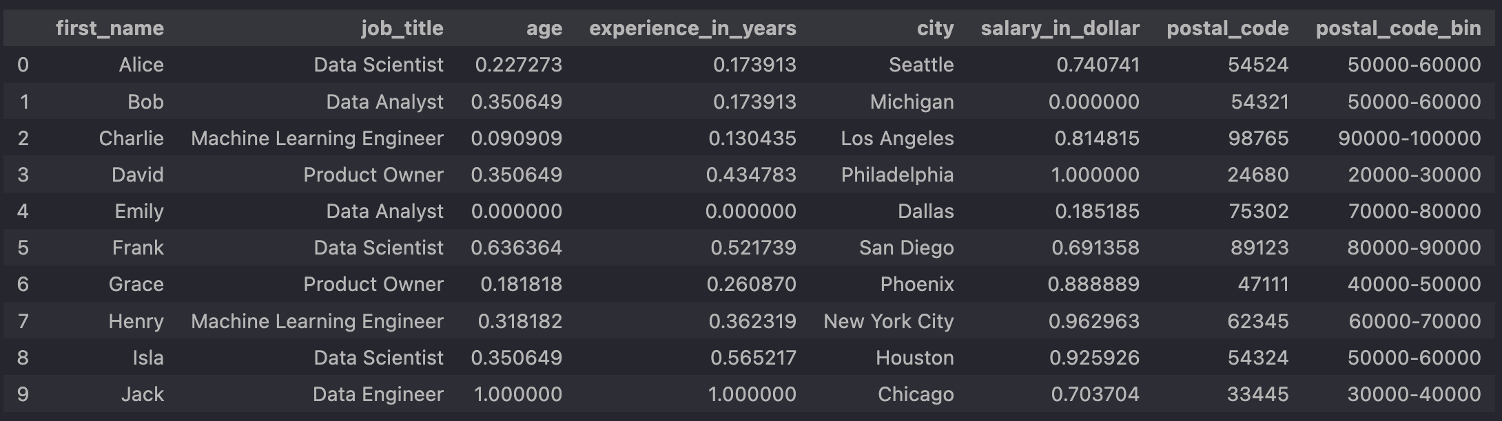 postal_code_bin , is added to the DataFrame to store the bin labels.