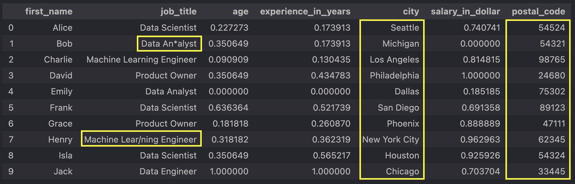 job_title ,city , andpostal_code_bin columns (created in the previous step)