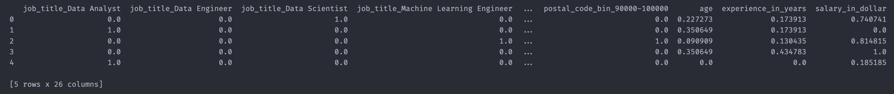("ohe", OneHotEncoder(handle_unknown="ignore", sparse_output=False), ["job_title", "city", "postal_code_bin"]) : Applies theOneHotEncoder to thejob_title ,city , andpostal_code_bin columns. -